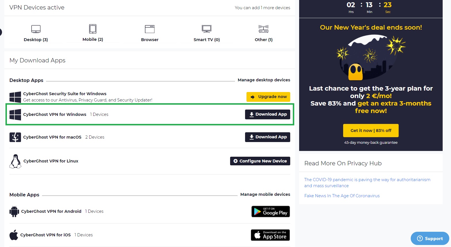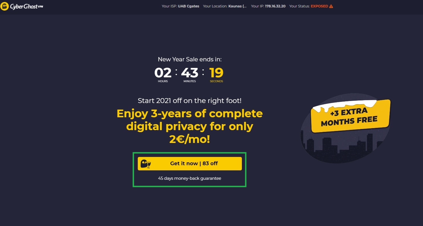 Pirmas žingsnis ką reikia padaryti, tai tiesiog įsigyti CyberGhost VPN iš oficialios svetainės. Rekomenduojame pasekti daugumos žmonių pavyzdžiu ir įsigyti CyberGhost maksimaliam laikotarpiui, kadangi pats CyberGhost tiekėjas tada siūlo ypatingas nuolaidas, negu perkant pavyzdžiui mėnesiui. Tam, kad įsigyti šį VPN, paspauskite ant nuorodos apačioje: