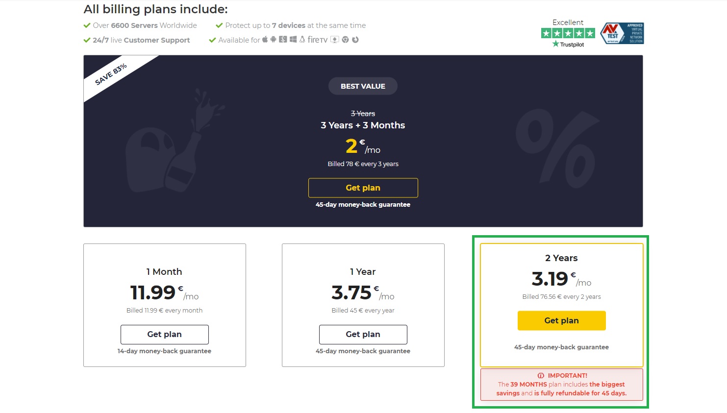 Paspauskite "Get it now", po ko būsite nukreipti į kitą puslapį, kur turėsite pasirinkti norimą planą. Apačioje paveiksliuke matosi kainos, kurios buvo šio straipsnio rašymo metu, jos dažnai keičiasi, tad kai skaitysit šį straipsnį, kainos gali būti pasikeitusios. Esmė ta pati, jei norit maksimaliai pigiai nusipirkti VPN, tai pasirinkit ilgiausią planą - šiuo atveju - 2 metų.