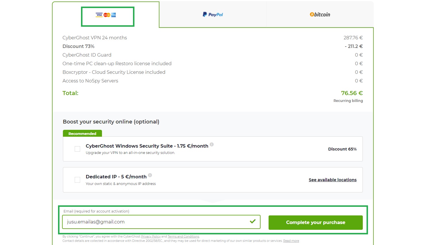 - Įvesti savo elektroninio pašto adresą, apmokėjimo būdą ir apmokėti;
