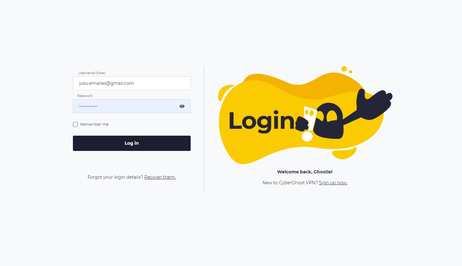 Taip atrodo prisijungimo į CyberGhost vaizdas. Įveskite savo elektroninio pašto adresą ir slaptažodį, tada spauskite "Log In":