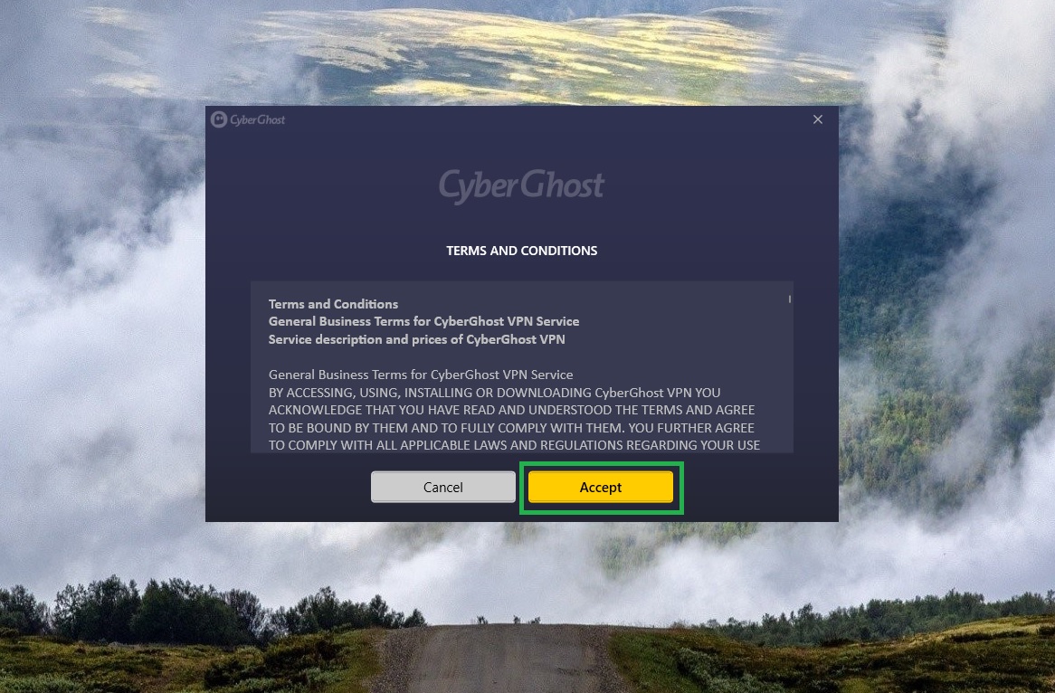 Taigi, parsisiuntus CyberGhost programą ir ją paleidus, jus pasitiks gražus langas, kuriame turėsite paspausti "Accept" mygtuką. Tai standartinis klausimas, kuriame jūsų klausia ar sutinkate su programos naudojimosi sąlygomis, nieko čia paslėpto nėra, tai tiesiog spauskite "Accept". Po to, programa bus suinstaliuota į jūsų kompiuterį ir automatiškai pasileis pati.