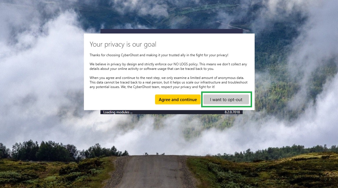 Kai programos instaliacija baigta, gausite sekantį klausimą, į kurį atsakykite paspaudę "I want to opt-out". Tai susiję su CyberGhost programos gerinimu. Tai nėra būtina, todėl paspauskite pažymėtą žaliai mygtuką.