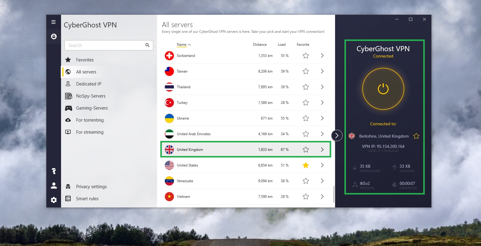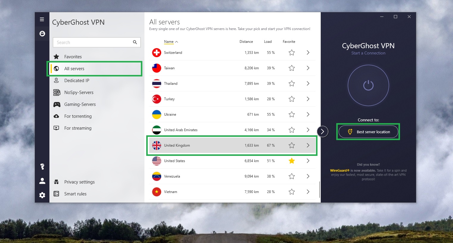 - CyberGhost - jeigu gyvenate užsienyje, tai CyberGhost turėtų būti jūsų pasirinkimas, kadangi siūlo lietuviškus IP adresus. Tad jei gyvenate užsienyje ir norit žiūrėti lietuvišką televiziją iš užsienio nemokamai - rinkitės tik CyberGhost VPN.