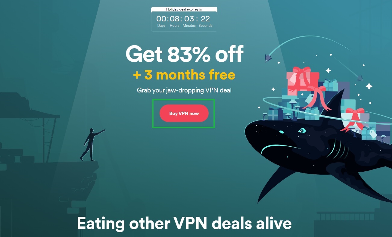 Tada atsirasite Surfshark VPN oficialiame puslapyje, kur ir galėsite pradėti šio VPN įsigijimą. Atsidariusiame lange spauskite "Buy VPN now" mygtuką. Automatiškai bus pritaikytas didelės nuolaidos kodas.