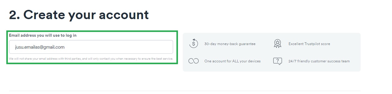 Pasirinkus planą, sekančiame žingsnyje jums reikės įvesti savo elektroninio pašto adresą, į kurį Surfshark atsiųs specialų laišką, kuriame rasite Surfshark paskyros aktyvacijos nuorodą. Taigi, sekančiame etape, įveskite savo elektroninio pašto adresą, pasitikrinkite keliskart, kad įvedadate teisingą. Tai svarbu.