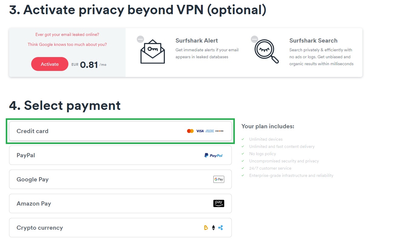 Sekančiame etape (3), galite aktyvuoti papildomas paslaugas (nebūtina), kurios jums suteiks ekstra saugumo, pavyzdžiui, galite gauti pranešimą, kada jūsų elektroninio pašto adresas yra nutekinamas ir patenka į hakerių rankas, tuomet jus Surfshark įspėja, kad jūsų elektroninis paštas buvo nutekintas ir jums reikia pasikeisti slaptažodį. Antra funkcija, kurią gautumėt papildomai tai būtų paieškos sistema, kuri jūsų ieškomų dalykų nesektų ir nekištų erzinančių reklamų (Google, deja seka, ir grūda reklamas). Šį žingsnį galite praleisti, jei nenorite šių papildomų galimybių.