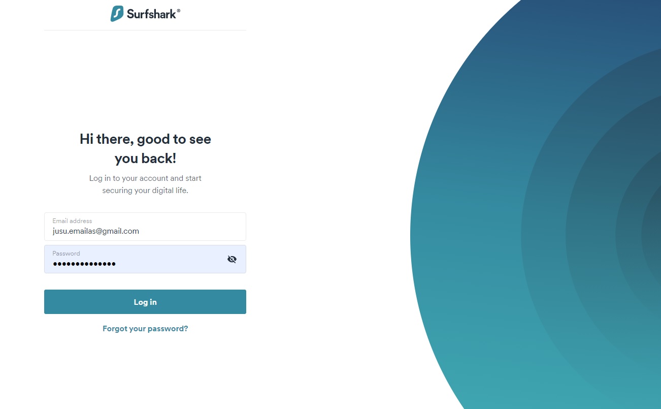 Po sėkmingo apmokėjimo, turėtumėt gauti elektroninį laišką nuo Surfshark, ten rasite specialią nuorodą, ant kurios paspaudus, aktyvuosite savo Surfshark paskyrą ir sekančiame etape galėsite prisijungti prie Surfshark portalo. Apačioje pavaizduotas prisijungimo į Surfshark portalą langas.