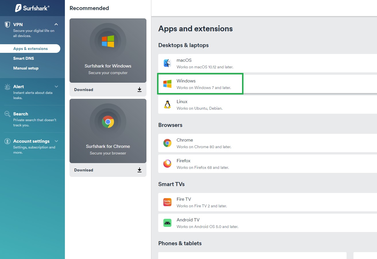 Sėkmingai prisijungus prie Surfshark portalo, matysite visas šio tiekėjo palaikomas platformas. Jei naudojate Windows, tai pasirinkite žaliai pažymėtą mygtuką, kad parsisiųsti Surfshark programą, kurią poto ir paleiskite.