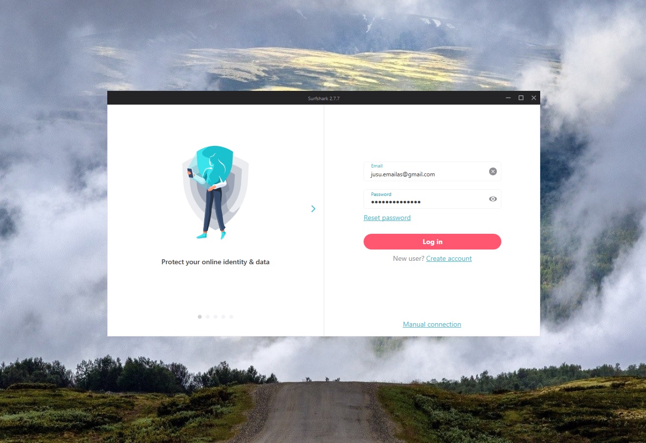 Surfshark programa automatiškai turėtų susiinstaliuoti jūsų nevargindama įvairiais klausimais, tad sekantis vaizdas, kurį turėtumėt matyti būtų toks kaip apatinėje nuotraukoje. Ten turėsite įvesti tą patį elektroninį pašto adresą, kurį naudojote prisijungimui į Surfshark portalą, ir tą patį slaptažodį.