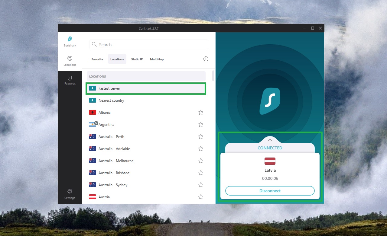 Rekomenduojama visada pasirinkti greičiausią serverį iš sąrašo (Fastest server) ir programa jus automatiškai prijungs prie greičiausio tuo metu VPN serverio. Mano atveju - prijungė prie Latvijoje esančio serverio. Jeigu norite kitokios šalies IP adreso - pasirinkite iš sąrašo kitą šalį patys.